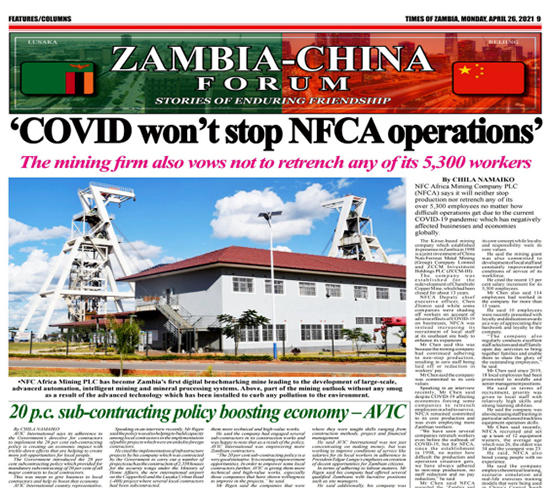 4月26日,贊比亞影響力最大的主流媒體贊比亞時報在“贊中友誼論壇”頭條位置,再次講述了中國有色集團出資企業中色非洲礦業公司(簡稱:中色非礦)故事——“疫情下,中色非礦不會裁減任何一個贊比亞員工”。同期財稅專版,還刊載了中色非礦自成立以來累計繳納稅收達2億美元,用行動踐行“中贊合作、共同發展”理念,積極支持贊比亞經濟發展的專題報道。
