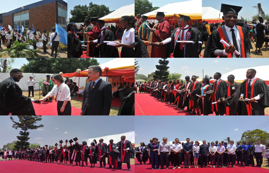 贊比亞當地時間10月6日,中國-贊比亞職業技術學院(以下簡稱:中贊職院)首屆畢業典禮在贊比亞盧安夏隆重舉行。贊比亞科學技術部技術教育與培訓司司長Simumba Alex 、贊比亞職業技術教育管理局局長Cleophas Takaiza、贊比亞盧安夏地區專員 Oncemore Ngonomo、中國有色集團在贊比亞出資企業中色盧安夏總會計師余新亮、中色盧安夏贊方副總經理Robert Kamanga蒞臨現場并致辭。中國教育部職業教育與成人教育司副司長林宇、北京工業職業技術學院等10所試點合作院校領導發表視頻致辭,各院校教師代表現場出席畢業典禮。